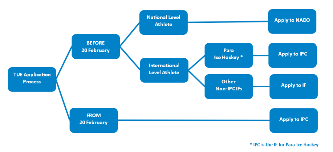 Prior to 20th February, athletes must determine where to apply for a TUE. If they are considered an International-level Athlete by their IF's rules they must submit their TUE application to their IF. If not, athletes should contact their National Anti-Doping Organisation (NADO) for further advice.