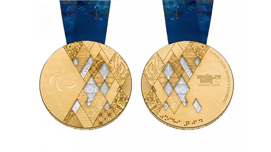 The medals of the Sochi 2014 Paralympic Winter Games are adorned with overlapping diamond shapes in a patchwork quilt design of varying Russian cultural and ethnic patterns. The front face of the medal features the Paralympic logo next to the solid gold and translucent pattern. The medals showcase nature-based designs, spanning the country with the sun beaming across snow-covered mountains and onto the black sand beaches.